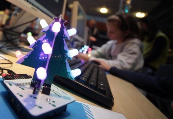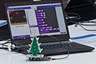 This Christmas tree has programmable LEDs. It has two feet for the Micro: bit or for the Arduino Nano. So you can choose what you want to program the Christmas tree with.