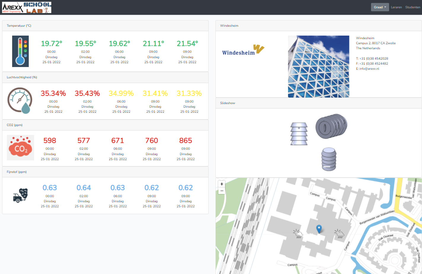 The SchoolLab Monitoring System can be used during lessons in primary and secondary education and monitors the most important environmental factors by means of a LoRa system that measures climate and air quality indicators such as temperature, humidity, CO2, particulate matter, light intensity and air pressure.